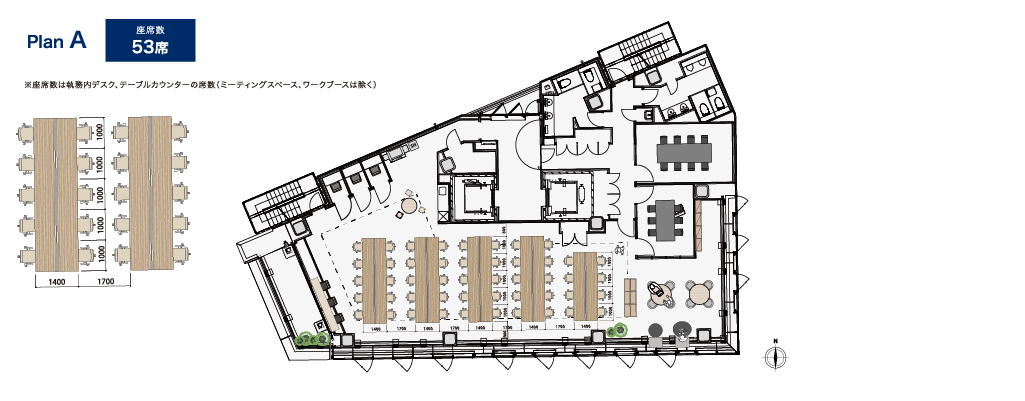 窓側にミーティングスペースとテーブルカウンターを配置した47席のプラン